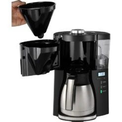 | Weitere Vorteile | Ein Hingucker in jeder Küche: durch die hochwertigen Stainless Steel Elemente.Heißer Kaffeegenuss – dank der Thermkanne. Durch das hochwertige Material punktet die Kanne durch Bruchsicherheit. Einfache Anwendung ohne Aufdrehen: der Easy Click Deckel ermöglicht eine einfach einhändige Bedienung.Kaffeemaschine mit Timer: die Melitta® Look® Therm Timer. Der Timer kann minutengenau eingestellt werden und ist leicht ablesbar über das LED Display.Der frisch aufgebrühte Filterkaffee kann länger heiß genossen werden mit Hilfe der dreistufigen Warmhaltefunktion. Hier können Sie zwischen 20, 40 oder 60 Minuten wählen.Die Kaffeestärke kann nach Ihren eigenen Vorlieben eingestellt werden, dank des AromaSelector®. Ohne die Wasser- oder Kaffeemenge anzupassen von mild bis kräftig wählbar.Wassertank transparent mit Tassenskala |