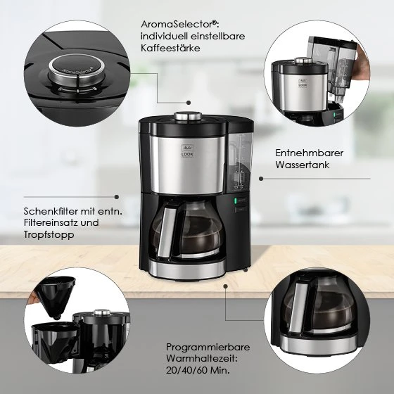 Die Melitta® LOOK® Perfection setzt Maßstäbe. Auf den ersten Blick fällt das moderne Design mit vielen hochwertigen Edelstahl-Elementen ins Auge. Auf den zweiten Blick wird sie dich mit zahlreichen Funktionen, wie dem abnehmbaren Wassertank und unserem patentierten AromaSelector® zur individuellen Einstellung der Kaffeestärke, begeistern. Und spätestens auf den dritten Blick wirst du sie dank des hervorragenden Kaffee-Ergebnisses lieben.
